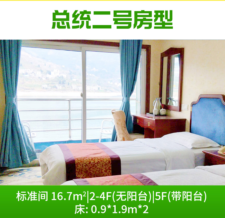 【住宿标准】长江传说号或维多利亚三号游轮江景标间(电视、中央空调、独立卫生间、热水淋浴)。指定楼层和房型按对应标准付费。